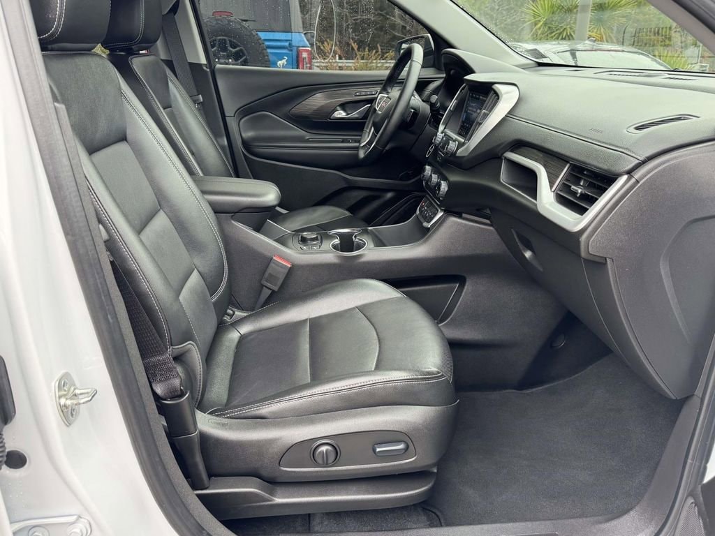 The exterior showcases GMCs signature bold grille design, LED headlamps and taillamps, 18-inch machined aluminum wheels, chrome accents, roof rails, and a hands-free programmable power liftgate for added convenience. Its sculpted body lines and premium details make it one of the most sought-after used GMC Terrain SLT SUVs available.